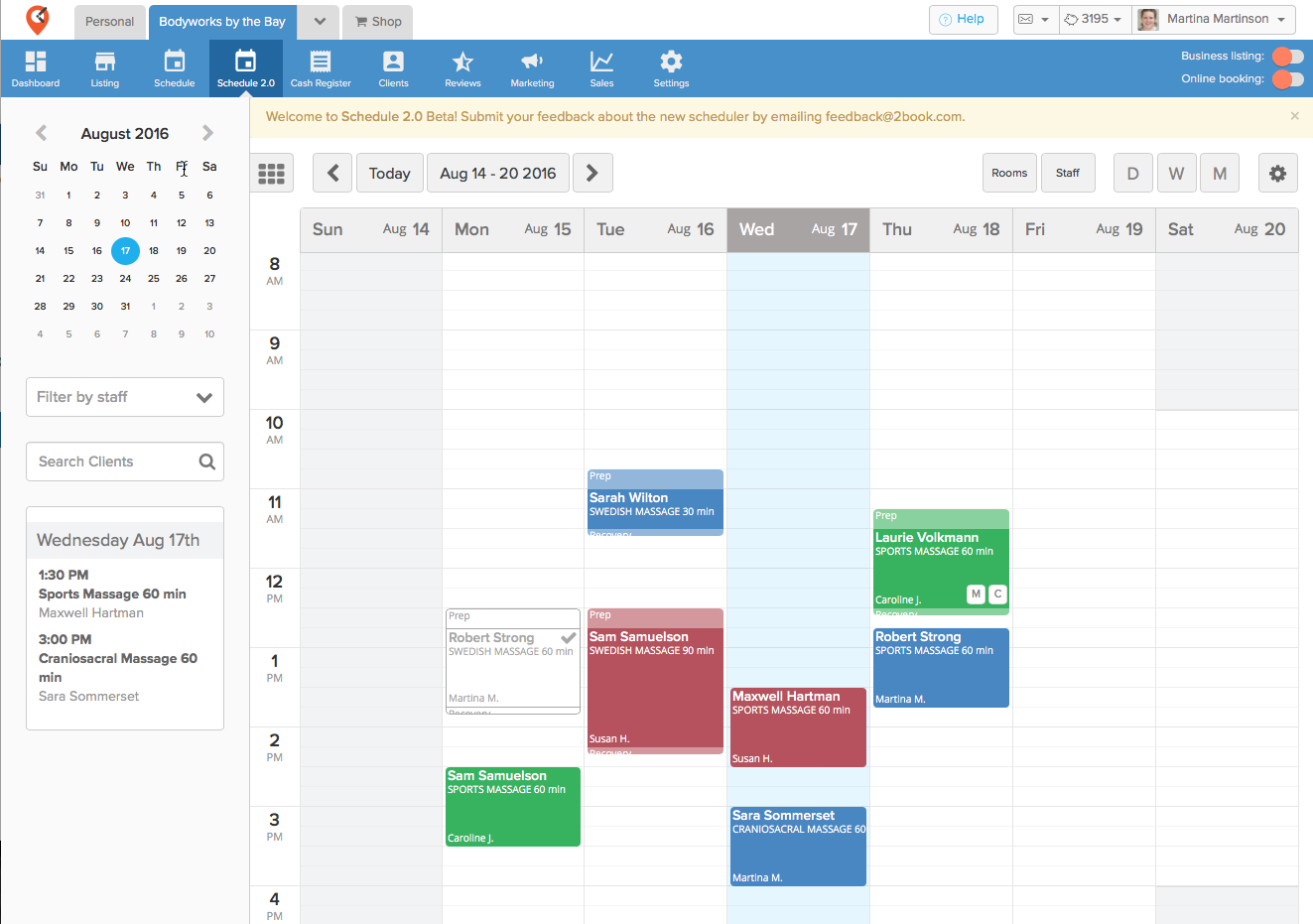 MassageBookers have been absolutely great about giving us lots of really helpful, detailed feedback on Schedule 2.0. Among several improvements, you’ll notice that we added back the list of upcoming appointments for the current day on the expandable pane to the left of the schedule. Due out next release is the ability to customize your appointment colors and to select whether you want to color appointment blocks by service, or color them by staff. FYI – We’re getting pretty close to saying “good-bye” to the old scheduling version. Expect it to be taken off the navigation menu in the next two to four weeks after we address all known issues.