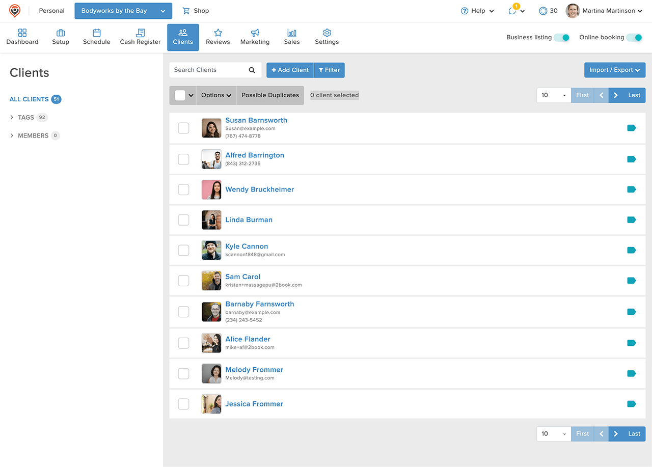 After seeing clients for the first time, the health of your business very much depends on how effective you are in getting that client to come back and see you again (and again). MassageBook tracks clients’ activity carefully to help grow the number of regular returning clients as well as providing a single place to track client specific information, including appointment history, contact information, messages, SOAP notes, intake forms and accounting records.