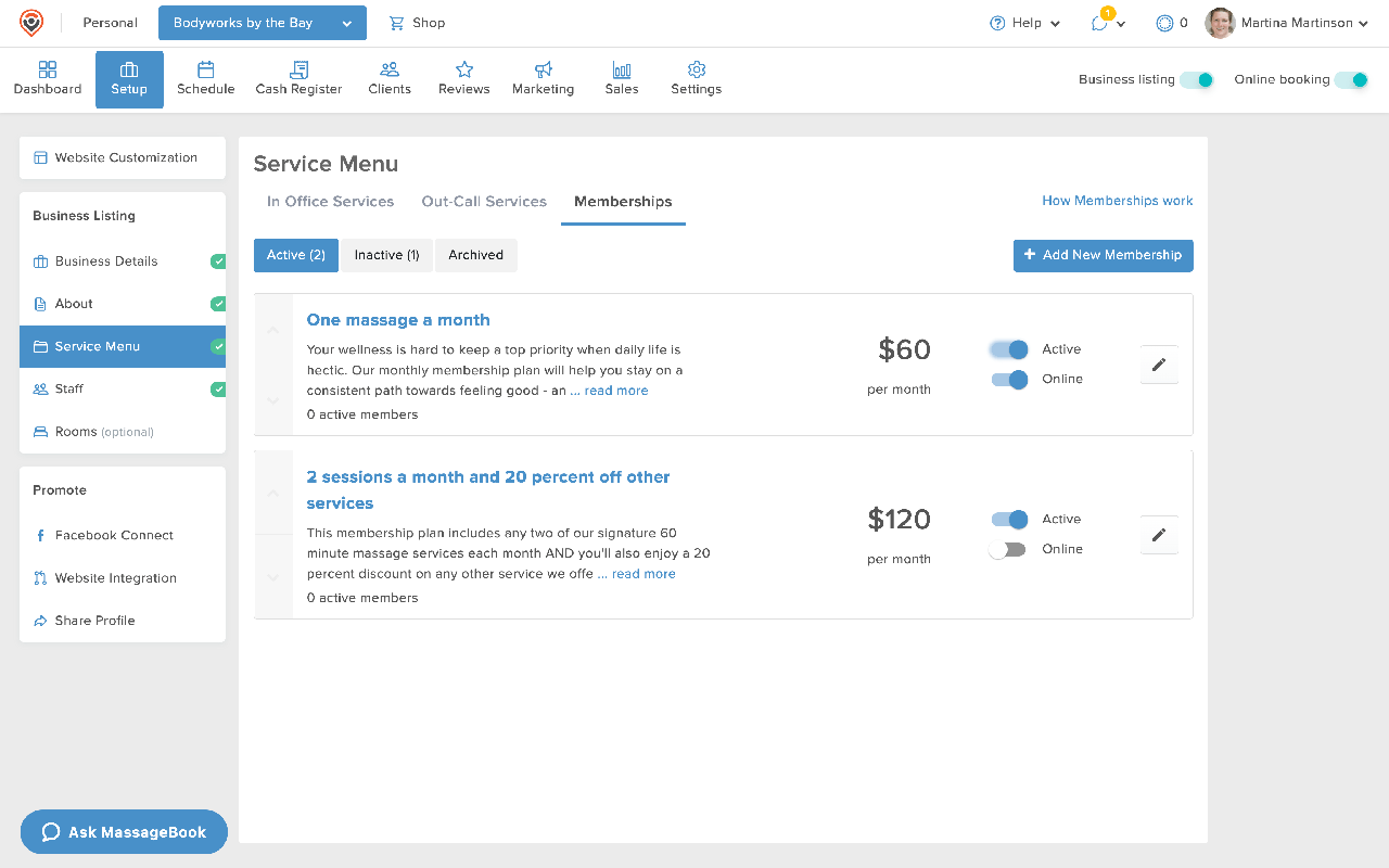 Membership plans (you may call them subscriptions) automatically bill your clients monthly for a specified number of services which they can then book directly through you or online on your existing website or on your MassageBook website. MassageBook allows for the easy creation of custom membership plans and automates billing and the seamless management of client activity.