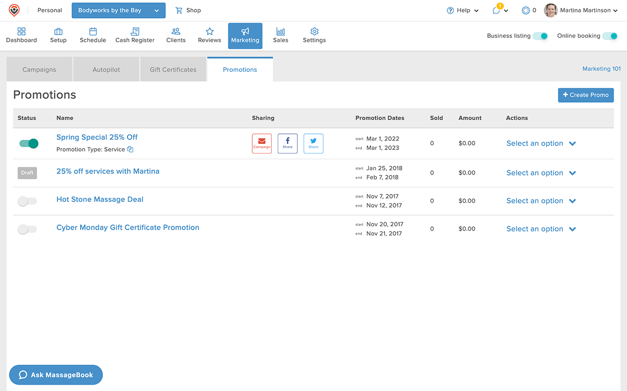 If you’ve been looking for ways to attract new clients and get your existing ones booking more often, you’re in good company - most businesses have the same sticky problem. The answer? MassageBook Promotions. Quickly create deals for any combination of services, time, staff or even gift certificates and promote them across email, social media, the MassageBook Directory, and any other website.