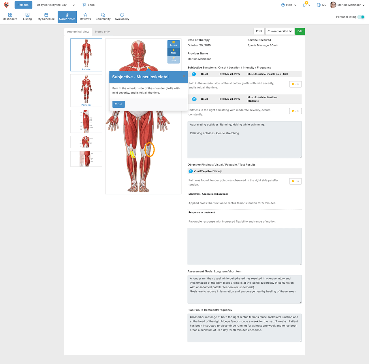 SOAP notes are not only a great way to keep track of your clients’ progress, they‘re required if you’re considering doing any insurance billing. MassageBook SOAP notes are easy to use and seamlessly tied to each client’s appointment records, making it easy find past notes and create new ones for a full historical view.