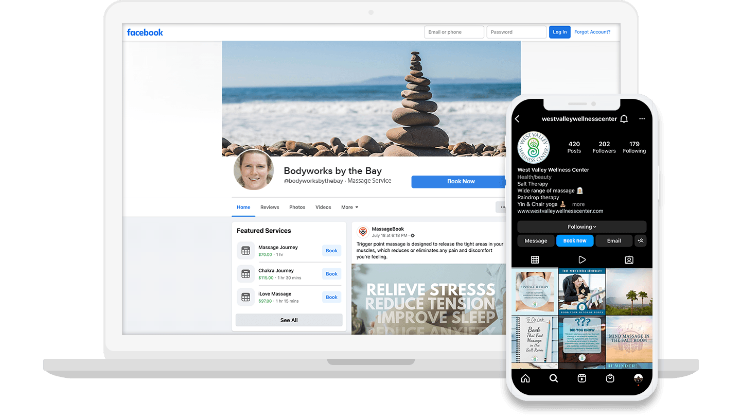 Facebook and Instagram. Hundreds of millions of people scroll through these social media apps every month. But are you using them to drive new business to your practice? MassageBook lets you add online booking to your business pages so you can start converting visitors into paying clients. Magic? Nah. Just one more handy tool we provide to help grow your practice.