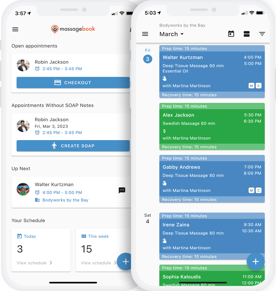 MassageBook Manager gives you the freedom to run your practice when you're on the go. So even on your busiest days, when you're booked with back-to-back appointments, and you're feeling a little frazzled, wondering how you'll keep everything organized and moving forward, all you have to do is reach into your pocket and pull out your phone to get your daily tasks done quickly and efficiently. Download it on the App Store or Google Play to streamline everything from scheduling to payments and start enjoying a better practice management experience today.