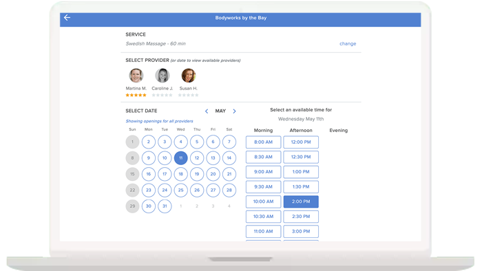 Clients can use their computer, tablet, or phone to select a service, provider, and opening based on real-time availability you've set up in MassageBook. It's that simple! Plus, they can pay and tip (optional) for appointments in advance. So now, all they have to do after a session is get off the table, get dressed, and simply walk out the door.