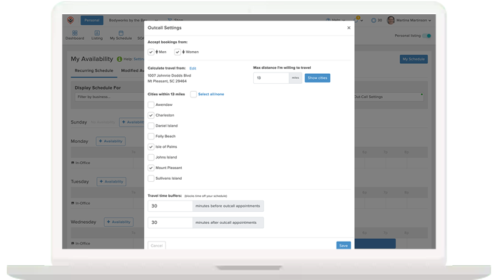 If you travel to clients to provide outcall services, MassageBook is for you. Set the max distance you're willing to drive, select the towns and cities where you're available, and enter the before and after travel time to factor into your schedule. Outcall services can only be booked online if the client's address and preferred appointment time fit within your settings.
