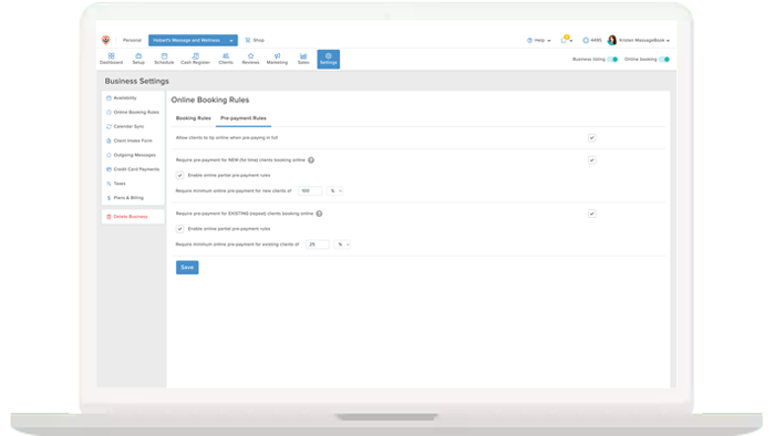 Prepayment rules help enforce your cancellation policy and streamline the post-massage checkout process for clients. You simply pick which clients (new and/or existing) must prepay to reserve their appointments and whether or not tips can be included with online payments. Full and partial prepayments are supported.