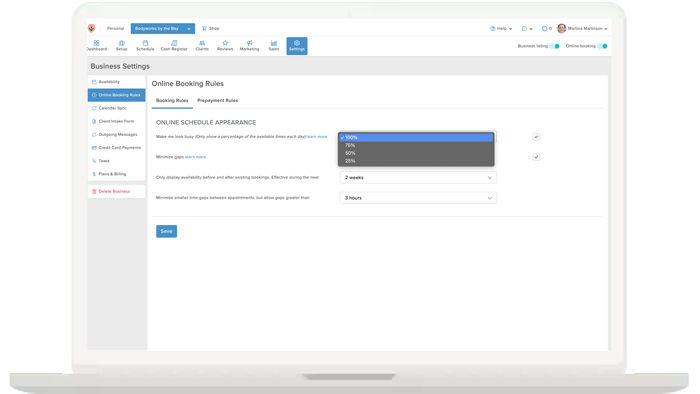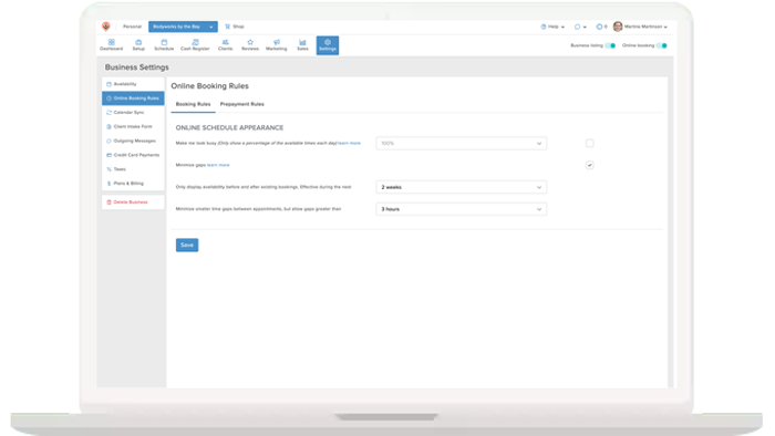 Suppose you're worried about clients booking scattered timeslots that create wasted time on your schedule. In that case, you'll love Minimize Gaps. This online scheduling feature automatically and intelligently modifies how your openings appear so that clients can only pick appointment times near existing appointments. How's that for efficiency?